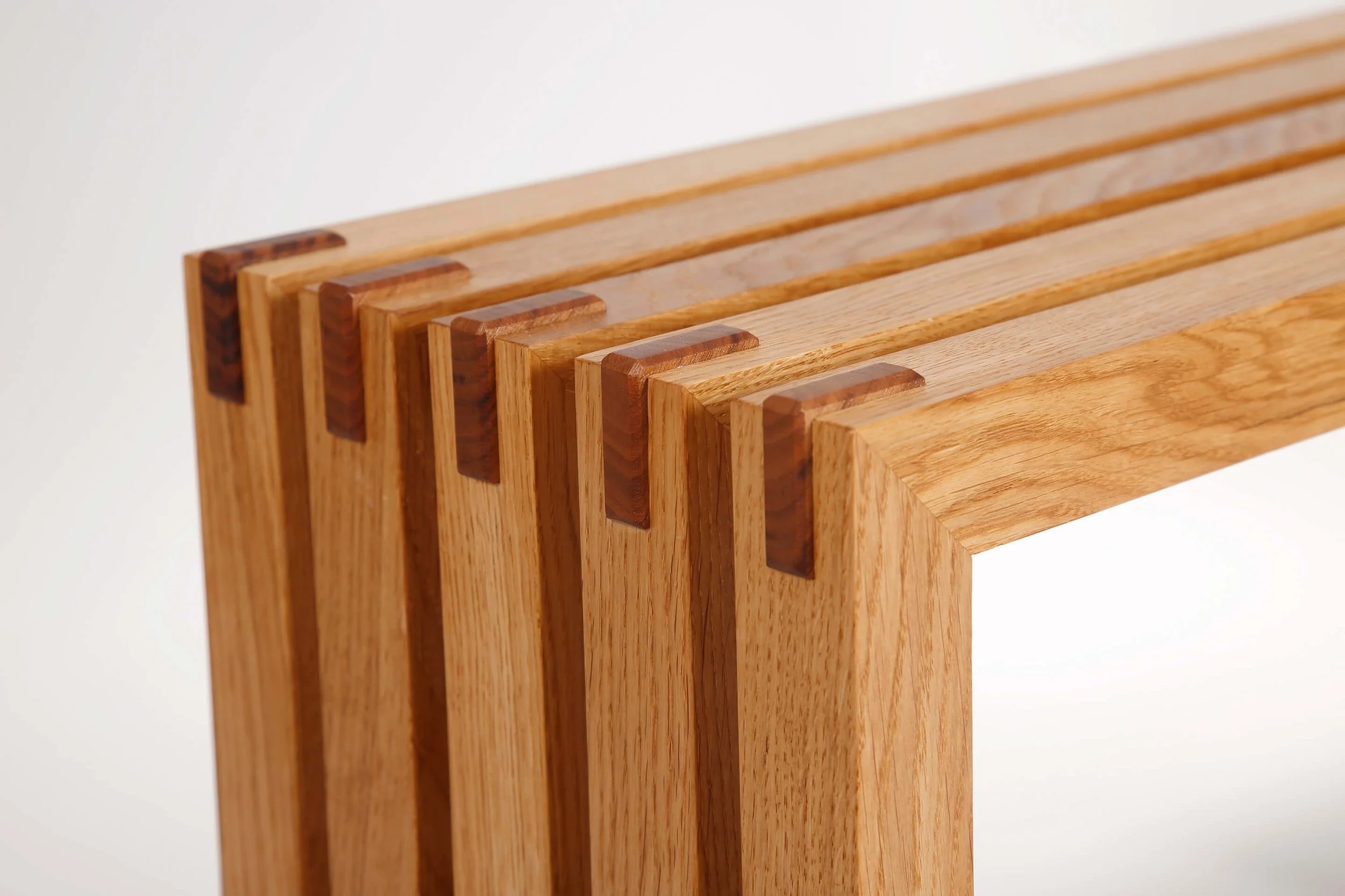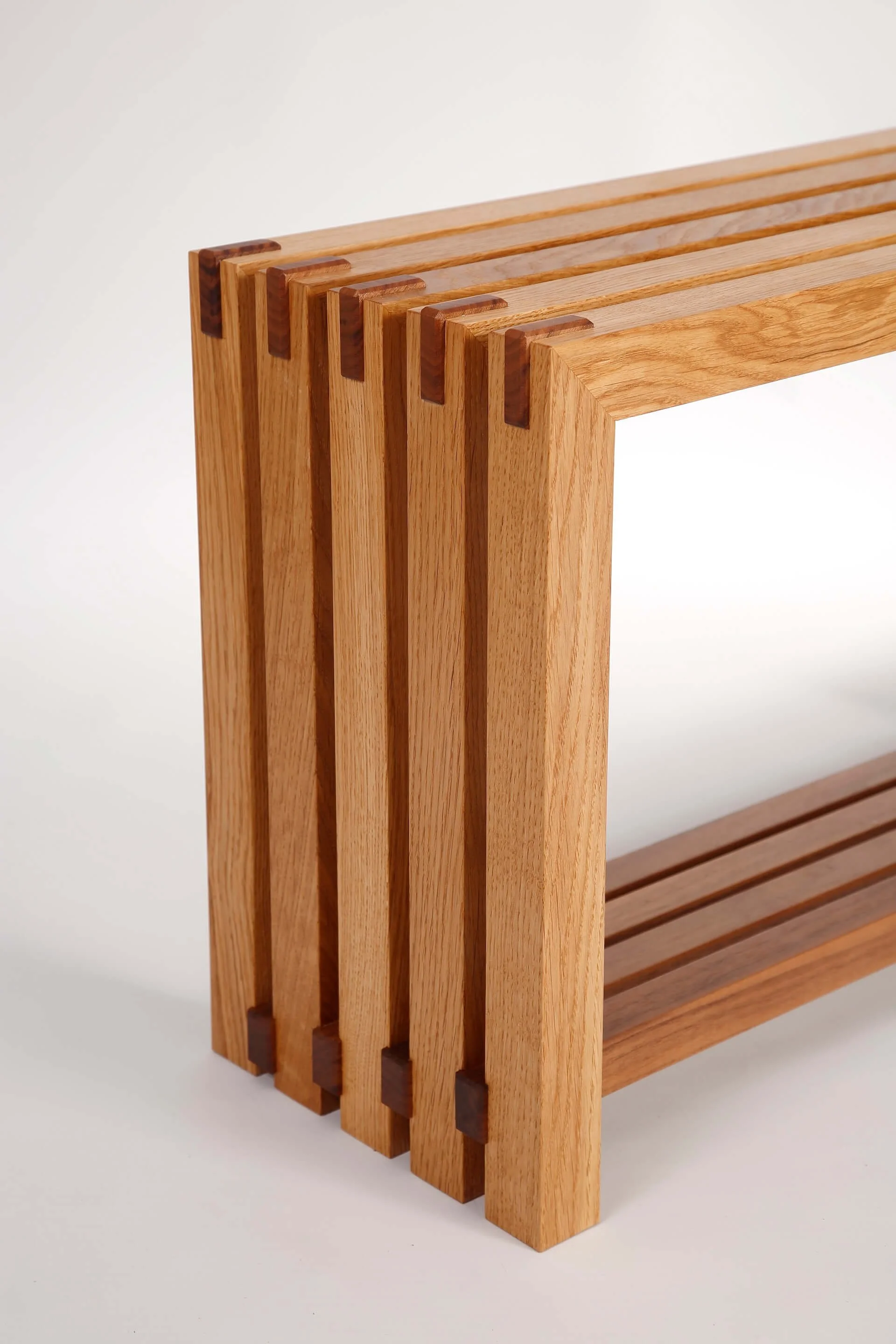 Built from English oak, the utility bench features mitred legs reinforced with floating tenons in contrasting American walnut. Below the seat, a stepped shoe shelf in walnut provides bracing and visual interest.
